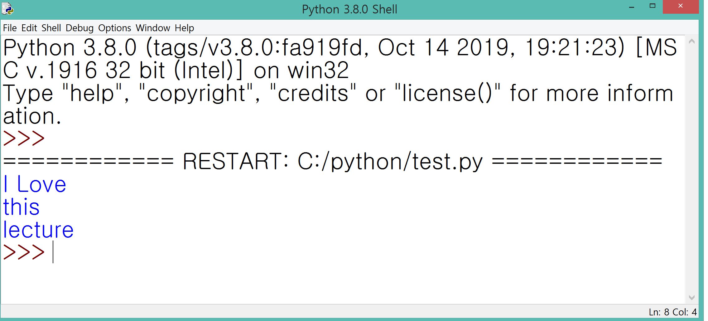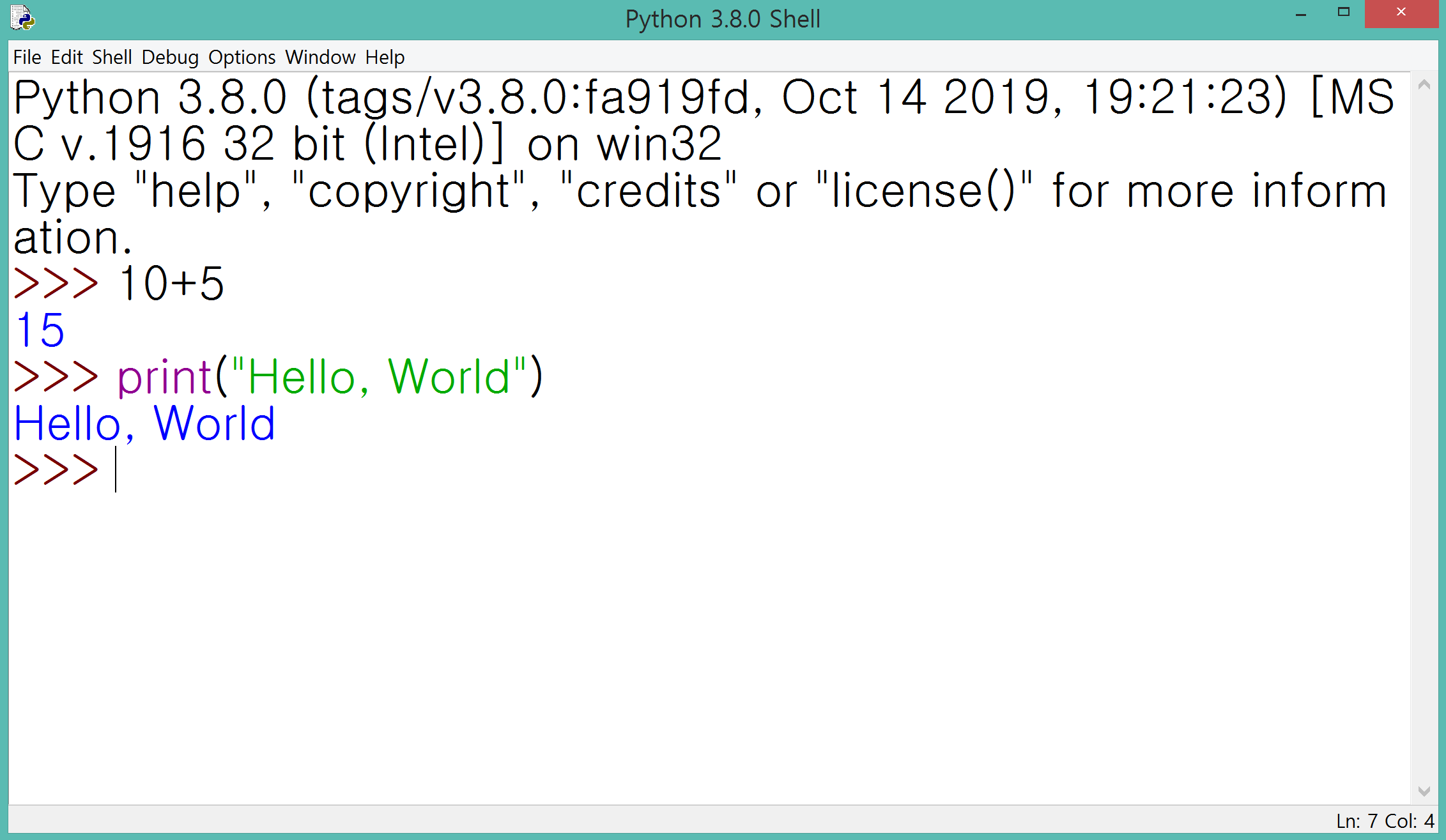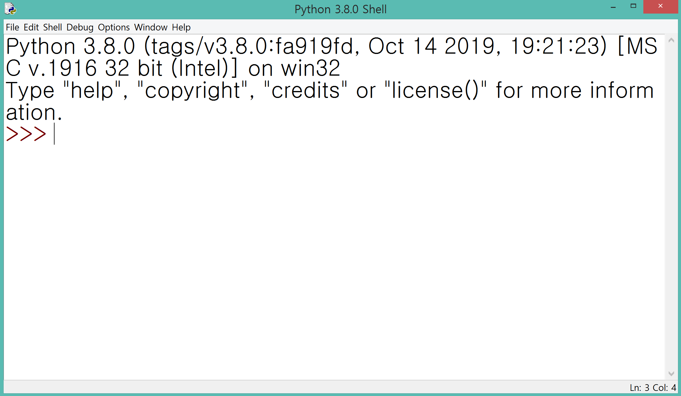 2. 다음과 같은 프로그램이 열립니다. 프롬프트(Prompt)라 불리는 >>>에 코드를 한 줄 한 줄 입력하면 실행결과를 즉시 볼 수 있습니다.