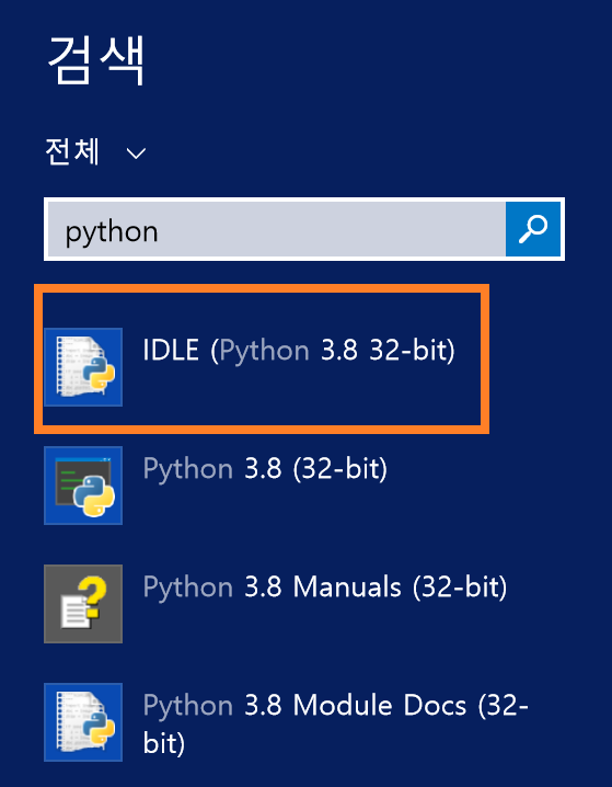 1. [윈도우 키 + f] 키를 눌러서 python 입력 후 IDLE를 클릭하여 실행합니다.