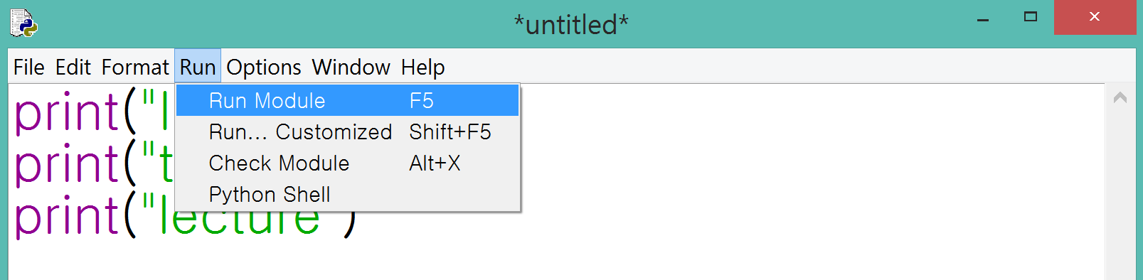 3. 파일을 실행하려면 [Run] - [Run Module] 메뉴를 클릭하세요. 단축키는 F5입니다.